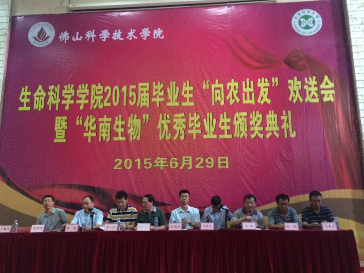 2015年6月29日下午佛山科學(xué)技術(shù)學(xué)院生命科學(xué)學(xué)院2015屆畢業(yè)生“向農(nóng)出發(fā)”歡送會(huì)暨“華南生物”優(yōu)秀畢業(yè)生頒獎(jiǎng)典禮在北院圖書館一樓報(bào)告廳舉行。佛山科學(xué)技術(shù)學(xué)院生命科學(xué)學(xué)院院長(zhǎng)王炳云、書記甘蔭全等學(xué)院領(lǐng)導(dǎo)、廣州市華南農(nóng)大生物藥品有限公司副總經(jīng)理黃國(guó)城、班主任、嘉賓、全體畢業(yè)生出席并參加了畢業(yè)生頒獎(jiǎng)典禮。