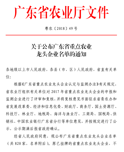 熱烈祝賀華南生物被認定為“廣東省重點農(nóng)業(yè)龍頭企業(yè)”