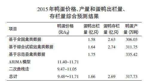 基于三種數(shù)據(jù)來源(全國禽類數(shù)據(jù)、12個蛋鴨主產(chǎn)省區(qū)禽類數(shù)據(jù)和示范縣禽類數(shù)據(jù))采用比例調(diào)整法對蛋鴨出欄量和鴨蛋產(chǎn)量進行了推算,預(yù)測出2015 年蛋鴨出欄量為1.66億只,與2013年相比增加20.29%,產(chǎn)蛋量為317.73萬噸,與2013年相比略有下降,下降幅度為5.92%;基于兩種數(shù)據(jù)來源(全國禽類數(shù)據(jù)、12個蛋鴨主產(chǎn)省份禽類數(shù)據(jù))對蛋鴨存欄量進行了預(yù)測,預(yù)測出2015年蛋鴨存欄量為2.69億只,與2013年相比增加39.38%;采取兩種方法(ARIMA模型和二次曲線法)對鴨蛋價格進行了預(yù)測,根據(jù)兩者預(yù)測結(jié)果匯總得出,2014年底至2015年初,每千克鴨蛋價格將維持在9.47元~11.71元之間,在節(jié)假日會有小幅上漲,與2013年相比基本無變化。