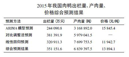 由于2013年受人感染H7N9流感事件的沖擊而價格和生產(chǎn)量均有所下降,進入2014年一直處于反彈增長趨勢,而且這一趨勢還會在2015年持續(xù)一段時期,因此,根據(jù)3種預(yù)測方法綜合預(yù)測:2015年肉鴨的出欄量為35.1152億只,較2013年增長14.55%;產(chǎn)肉量683.94萬噸,較2013年增長9.02%;白條鴨價格為13 894.1 元/噸,較2013年增長5.82%,在11 942.7~15 845.4元/噸波動。根據(jù)預(yù)測結(jié)果分析,2015年肉鴨產(chǎn)業(yè)將呈現(xiàn)平穩(wěn)增長的態(tài)勢。