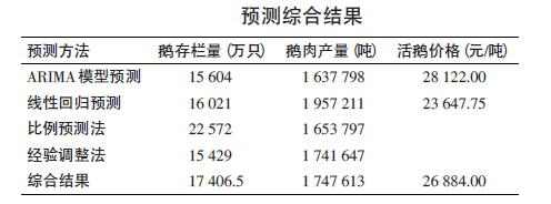 采用4種方法預(yù)測2014年鵝存欄量、鵝肉產(chǎn)量,以及2種方法預(yù)測2014年的活鵝價格(見表)。根據(jù)4種方法計算出的2014年鵝存欄量的平均值為17 406.5萬只,鵝肉產(chǎn)量為1747 613噸,鵝價格為26 884元/噸。另外,參照揚州大學(xué)徐琪根據(jù)我國鵝品種統(tǒng)計的鵝年存欄量21195萬只,可以估算出2014 年我國鵝年存欄量將處在1.7億~2.1億只之間。因此,上述綜合預(yù)測結(jié)果是可信的。