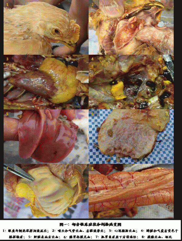 剖檢可見喉頭、氣管粘膜充血、出血,氣管內(nèi)充滿粘液,肺臟出血,氣囊渾濁、有黃色干酪樣物質(zhì),心冠脂肪有針尖樣出血,部分雞肝臟略顯腫大、有少量出血點,脾臟腫大、部分有白色斑點狀壞死,腎臟腫大、部分有尿酸鹽沉積,盲腸扁桃體腫大,腺胃粘膜充血,肌胃角質(zhì)層下有斑點狀潰瘍,胰腺輕微出血、有白色壞死點,腸道黏膜出血。
