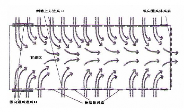 這種相對(duì)較新的通風(fēng)方法就是所謂的“過(guò)渡期通風(fēng)”,如下圖,其優(yōu)點(diǎn)是能在溫度上下波動(dòng)比較大或內(nèi)部環(huán)境變化較大的情況下進(jìn)行良好的通風(fēng)。進(jìn)行這樣的通風(fēng)時(shí),我們可以關(guān)閉雞舍前端為縱向通風(fēng)而設(shè)計(jì)的進(jìn)風(fēng)口,開(kāi)啟一半或較少的風(fēng)機(jī)讓新鮮空氣從雞舍側(cè)墻上方的進(jìn)風(fēng)口進(jìn)入。這樣做的好處是既能進(jìn)行有效的通風(fēng)又能改善雞舍內(nèi)空氣均勻混合,而且避免雞群受到冷應(yīng)激。