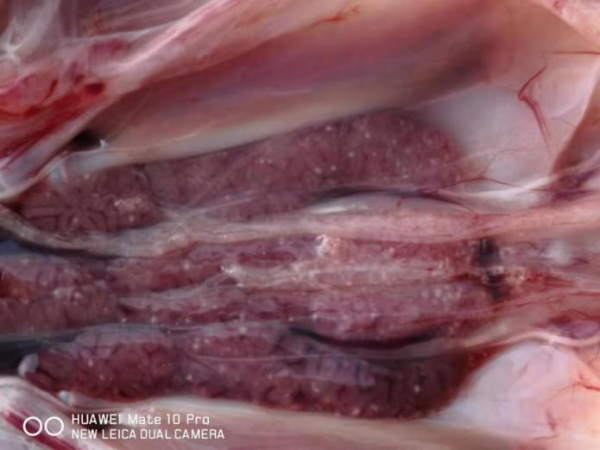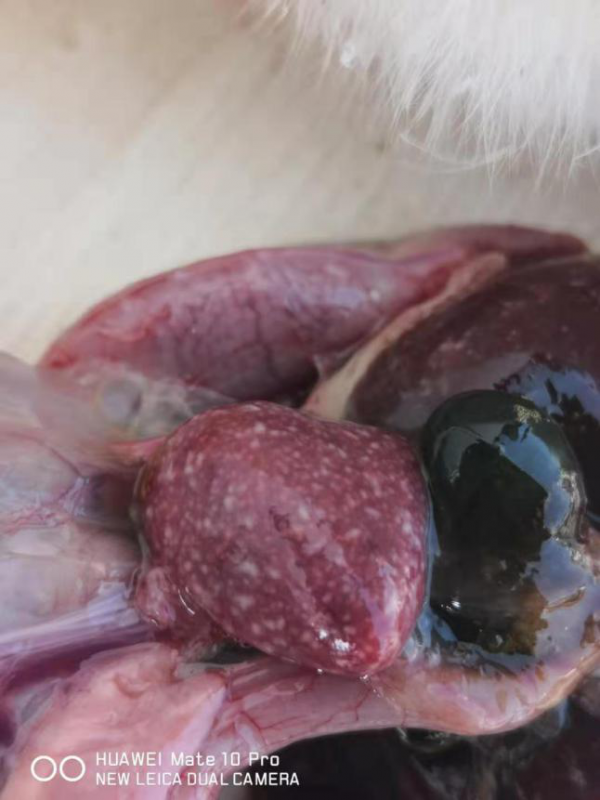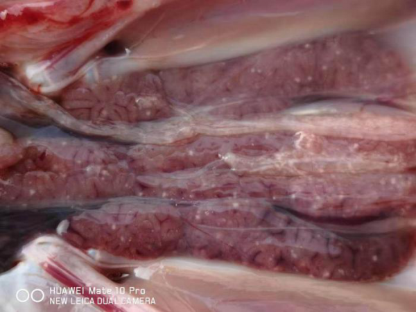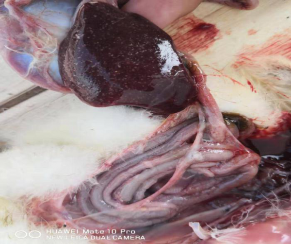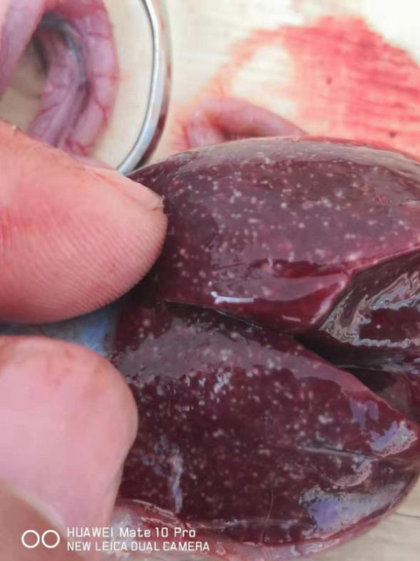 剖檢27天齡病死的小鵝,可見(jiàn)肝臟、脾臟、腎臟、腸道彌散針尖大白色壞死點(diǎn)。見(jiàn)下圖