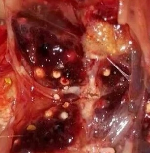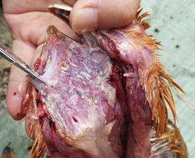 股骨頭壞死,股骨頭軟骨容易脫落;嗉囊白色假膜樣粘附物、潰瘍;腺胃腫大,壁變厚,腺胃乳頭腫脹、潰瘍,有的乳頭融合、界限不清;肌胃角質(zhì)層增厚、易裂開脫落,甚至出現(xiàn)明顯潰瘍灶;肺充血、出血,肺等器官可見霉菌結(jié)節(jié);肝腫大、質(zhì)脆變性;胸腺萎縮;雞掉毛或出現(xiàn)皮膚壞死。