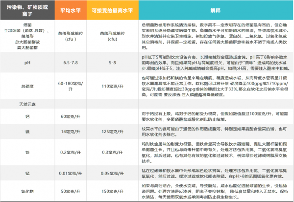 雞對水源中的礦物質(zhì)有較強的耐受力。但要注意微生物的生長,因為許多礦物質(zhì)也是微生物的營養(yǎng)物。最好通過軟化的手段控制錳、硫磺、鈉、鎂離子的含量,也間接地防止水垢生成。